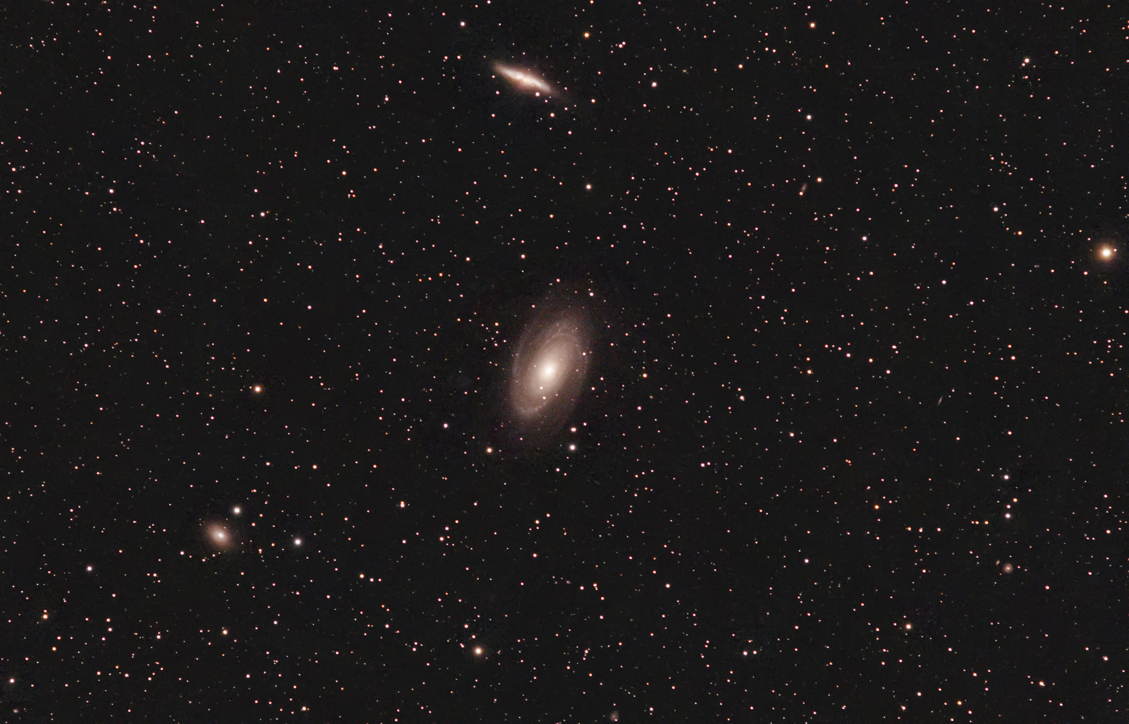 A famous interacting pair in Ursa Major, roughly 12 million light-years away. M81 (Bode’s Galaxy) is a grand-design spiral with tightly wound arms, while M82 (the Cigar Galaxy) is a starburst galaxy being reshaped by the gravitational interaction — its core is erupting with superheated hydrogen plumes visible as red filaments in H-alpha. With enough integration time, a faint tidal bridge of stars becomes visible between the two.