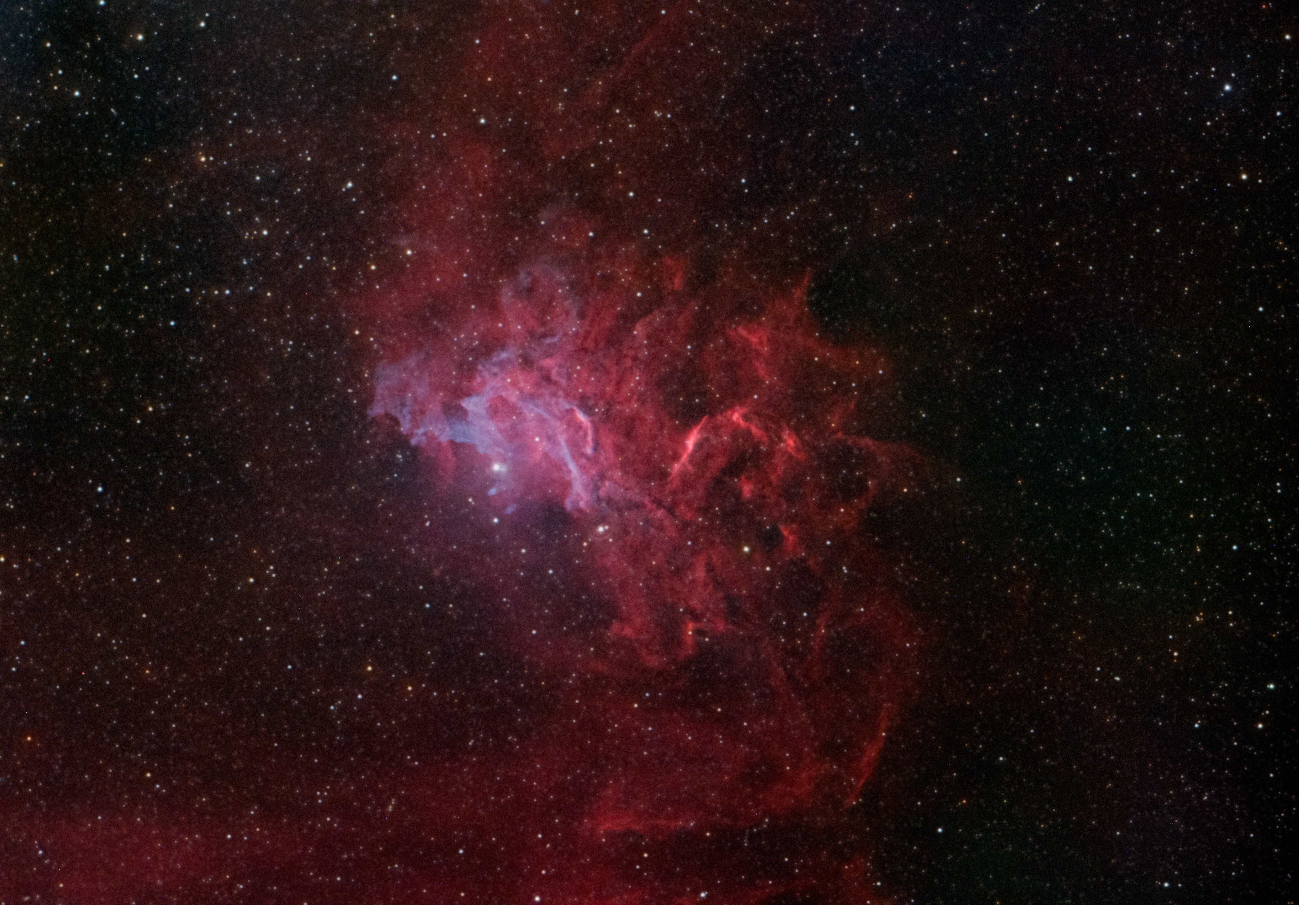 An emission and reflection nebula in Auriga, roughly 1,500 light-years away. The central star AE Aurigae is a runaway — ejected from the Orion Nebula region about 2.5 million years ago — and is now ploughing through this unrelated cloud of gas and dust, energising it as it passes. The blue regions are starlight reflected off dust grains, while the red is ionised hydrogen. The wispy, flame-like streamers give the nebula its name.