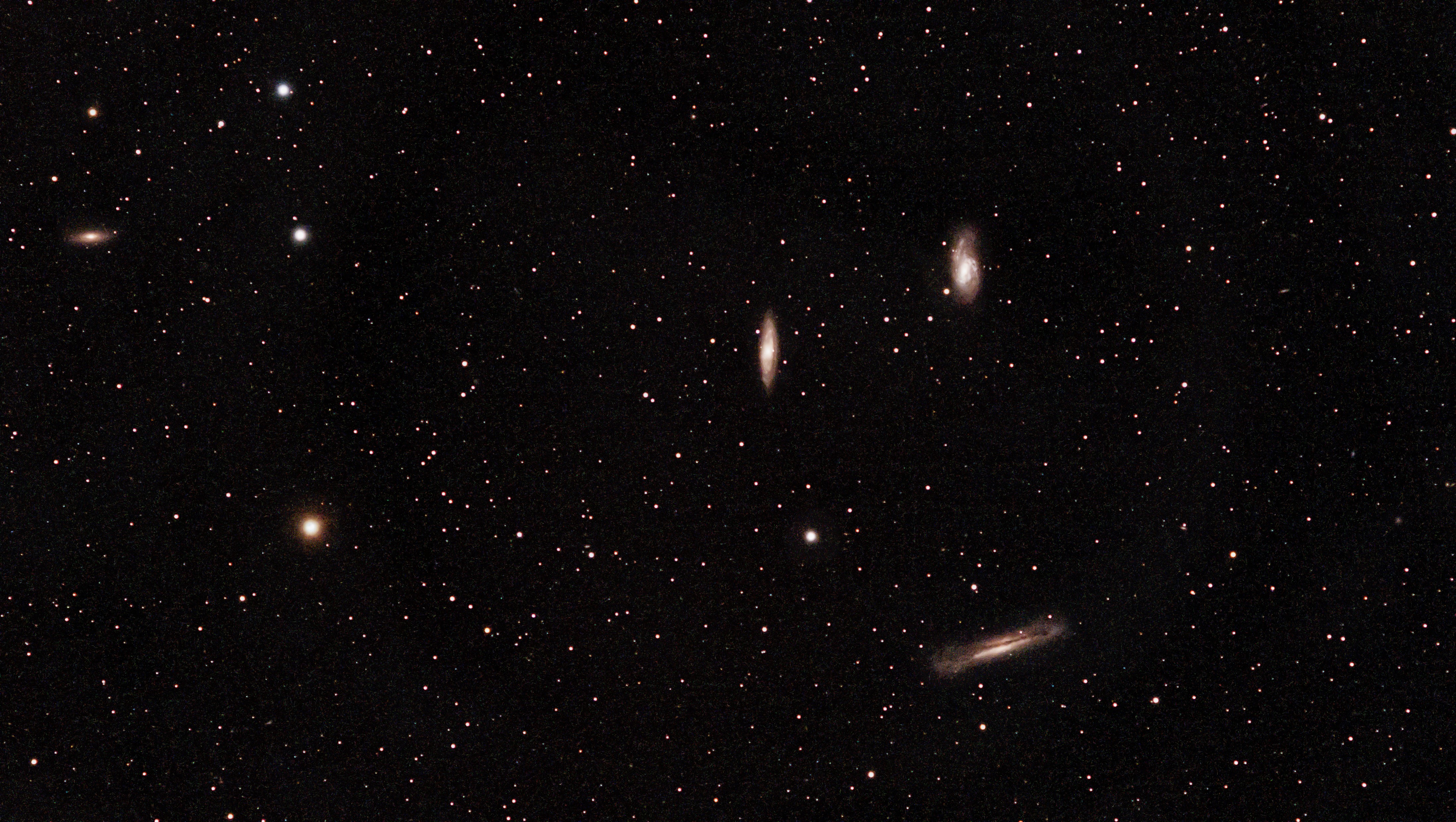 A beautiful group of three interacting galaxies in Leo, roughly 35 million light-years away. M65 and M66 are bright spirals visible in smaller scopes, while NGC 3628 (the Hamburger Galaxy) is seen edge-on with a prominent dust lane bisecting its disc. With deep integration, a faint tidal tail extends from NGC 3628 — a 300,000-light-year stream of stars pulled out by gravitational interaction with its neighbours.