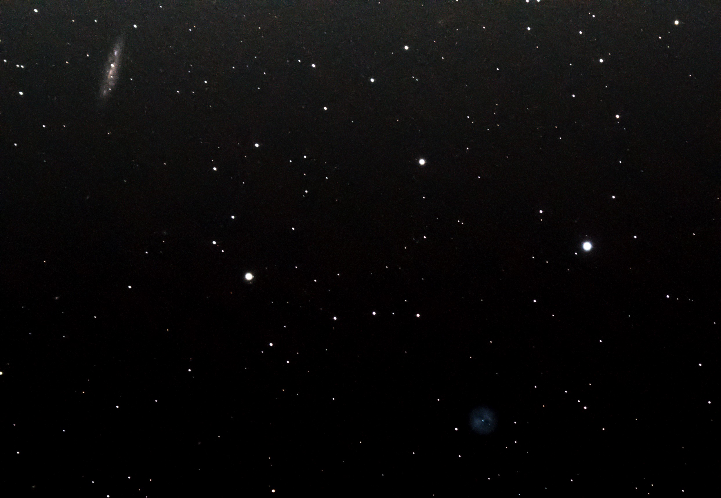 A planetary nebula in Ursa Major, roughly 2,030 light-years away. The two dark “eyes” that give it its name are cavities in the nebula’s shell where the gas is less dense, creating a face-like appearance. M97 is one of the more complex planetary nebulae — its three-dimensional structure is thought to be a torus viewed from an angle rather than a simple sphere. It’s a small target that rewards longer focal lengths and careful processing to bring out the subtle OIII and H-alpha structure.