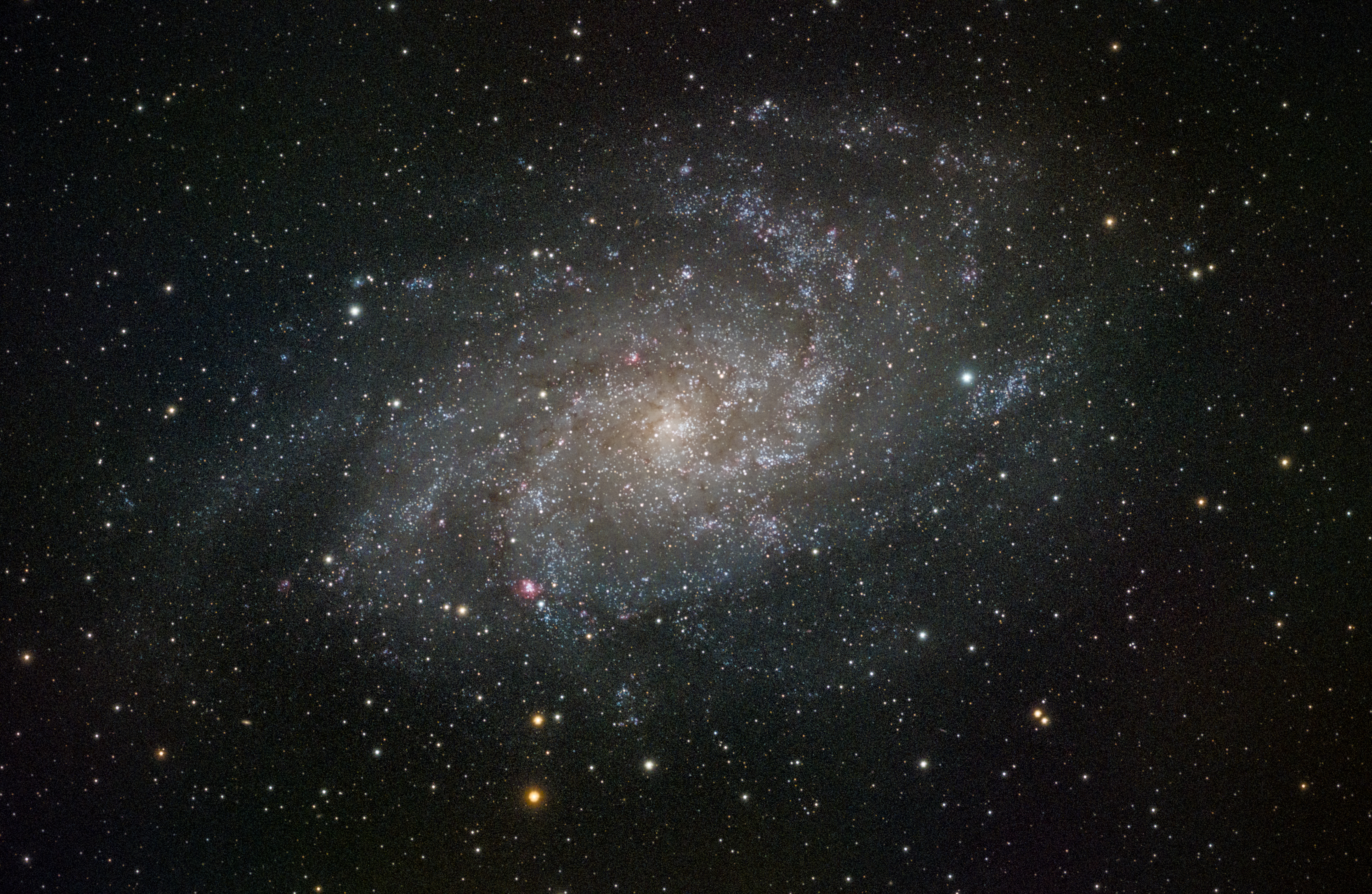 The third-largest galaxy in the Local Group after Andromeda and the Milky Way, about 2.73 million light-years away in the constellation Triangulum. M33 is a face-on spiral with loose, open arms packed with enormous HII regions — the largest, NGC 604, is one of the biggest star-forming regions known, dwarfing the Orion Nebula. Narrowband imaging brings out the pink hydrogen clouds scattered across the arms beautifully.